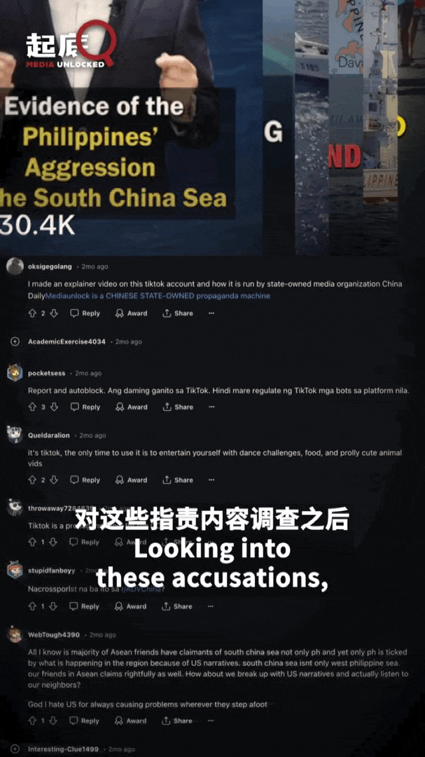 自今年1月起,中国日报起底工作室(@MediaUnlock)在TikTok上陆续发布了大约十条视频,从历史、法理和现实的角度驳斥菲律宾的非法主张。视频的内容包括揭露“菲律宾非法侵闯黄岩岛是为了摆拍炒作”“菲律宾民兵伪装渔民强闯黄岩岛”,这些视频从内容到观点都与西方媒体塑造的叙事完全不同,引发了很大反响。