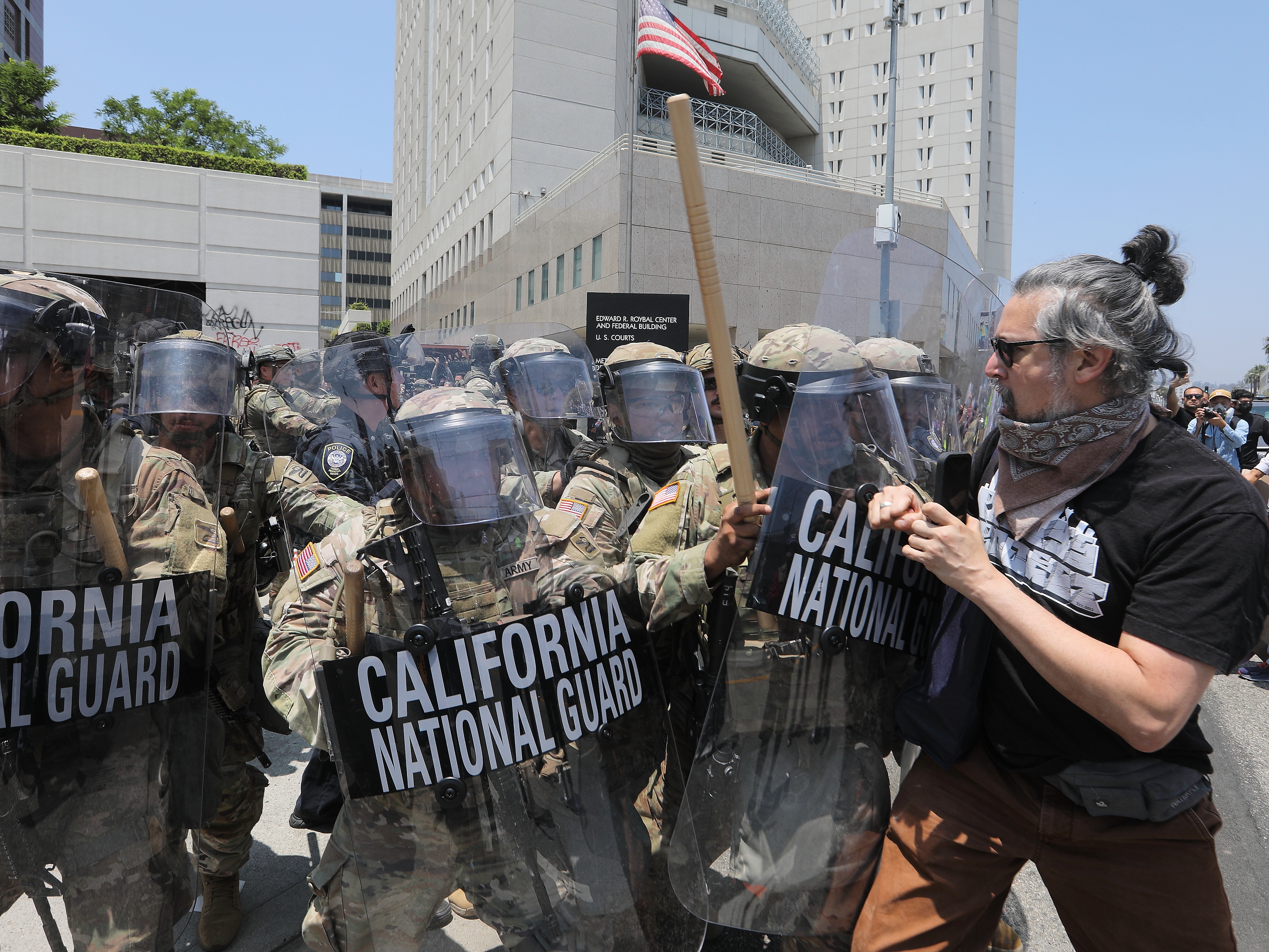 2025年6月8日,在美国加利福尼亚州洛杉矶市中心的联邦执法机构门前,抗议者与国民警卫队人员发生冲突。