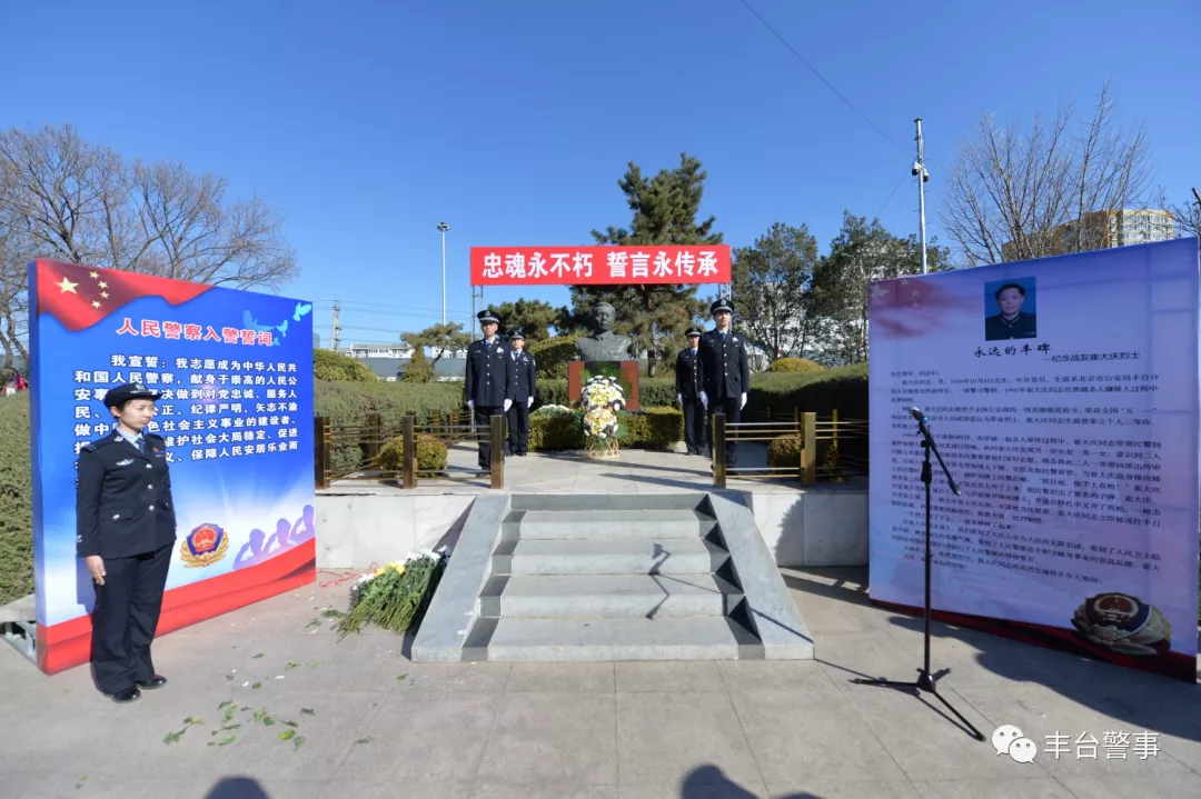 誓言永传承11日上午,丰台公安分局在丰台花园举行了“忠魂永不朽,誓言永传承”崔大庆烈士牺牲二十四周年纪念活动,青年民警们在烈士铜像前重温入警誓词,不忘誓言,传承崔大庆烈士精神。