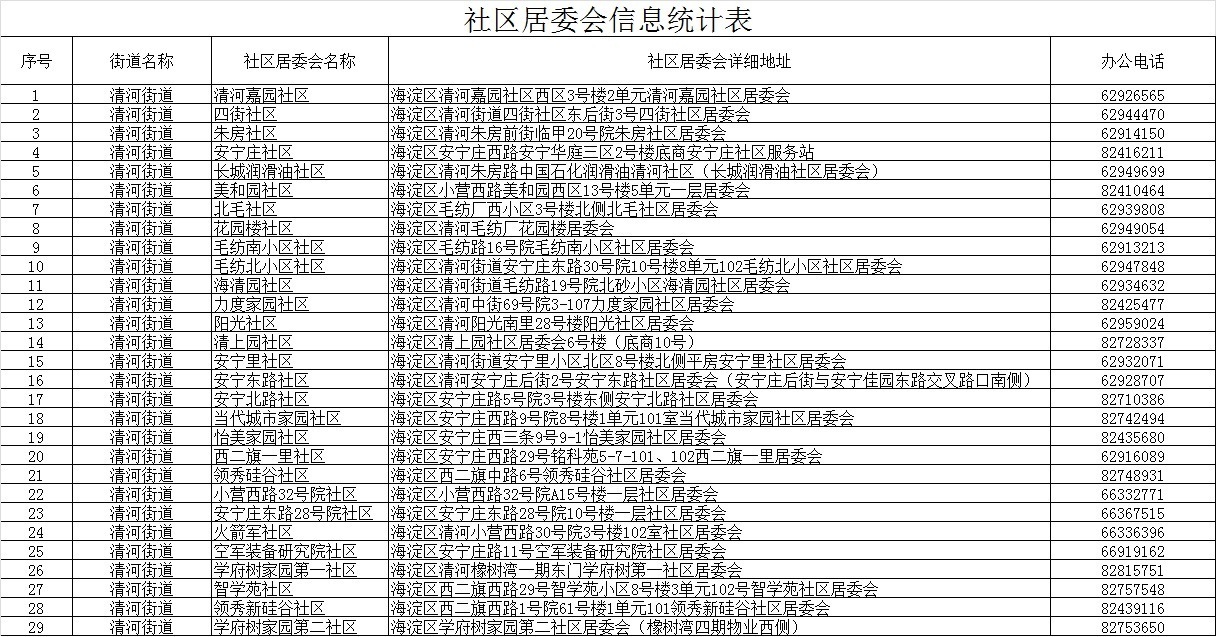 北京市海淀区清河街道社区居委会名录(2021年),2021,2021年,北京市,海淀区,清河,街道社区,居委会,名录