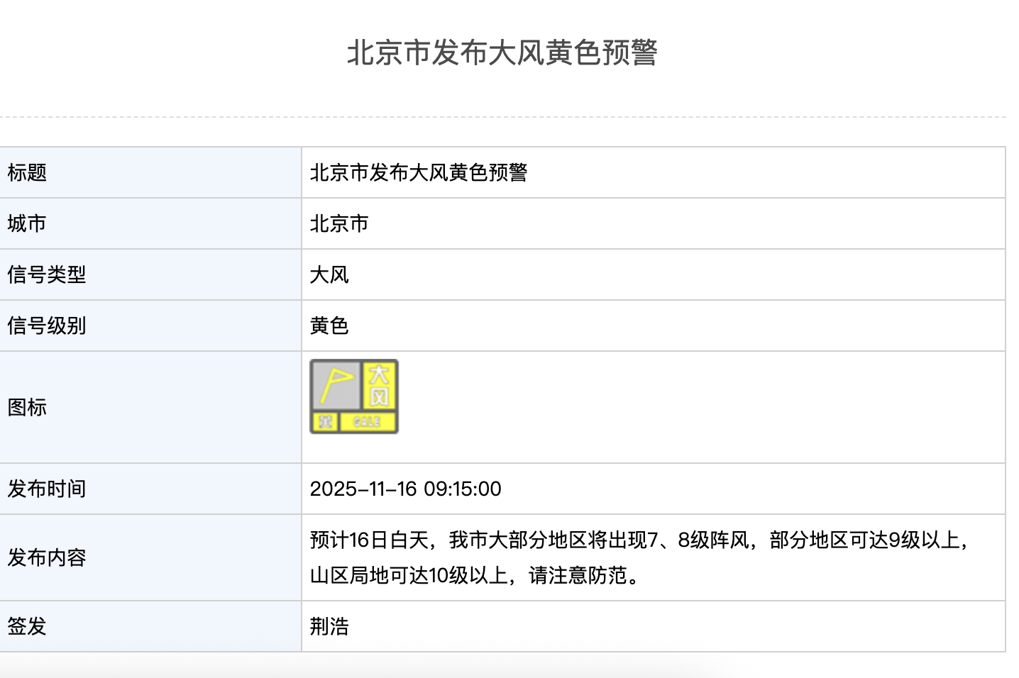 今天京城北风强劲,目前本市正处于大风黄色预警、寒潮蓝色预警中,预计16日白天,我市大部分地区将出现7、8级阵风,部分地区可达9级以上,山区局地可达10级以上,请注意防范。