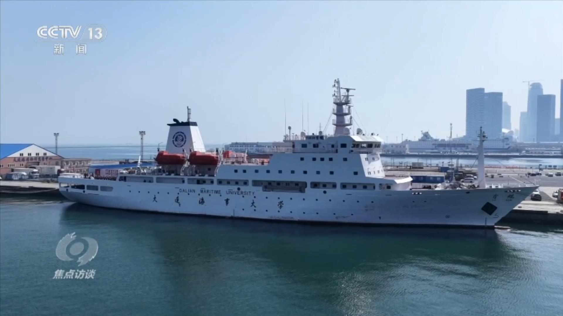 在我国首艘专用教学实习船“育鲲”轮上,大连海事大学的师生们在甲板上庄严宣誓,以青春之名立强国之志,向归来的志愿军英雄们致敬。