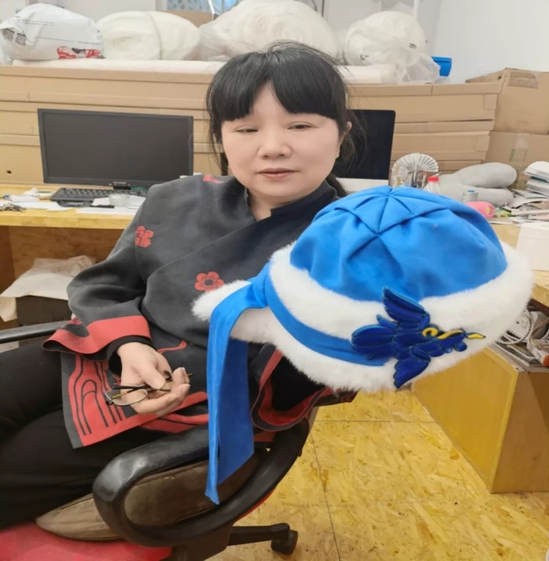 据贺阳介绍,这套颁奖礼服的设计灵感来源于鄂伦春族皮毛一体的服装。礼服上的图案有从传统瓷器纹样中提取的花卉,也有北京地区的保护动物;譬如灰喜鹊和戴胜等鸟类图形的剪影。礼服帽子的设计结构非常传统,这种折叠帽子最早出土于辽代实物。用一块布经过折叠变成圆形,不需要裁剪,符合中国传统设计的“节用”。两条飘带又让帽子更加美观并富有动感。