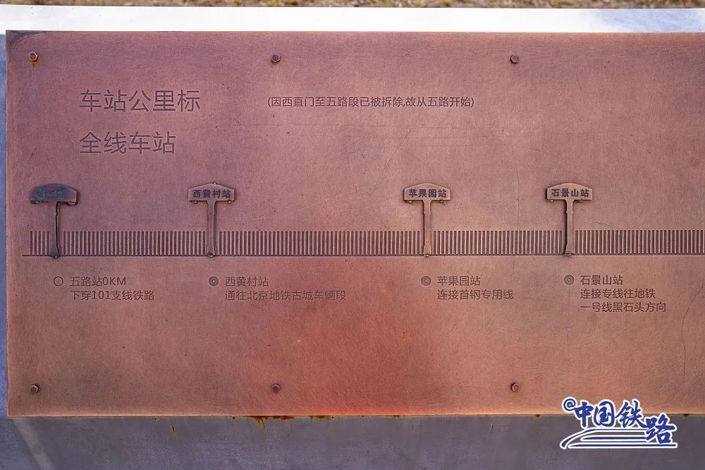 在一条长长的钢轨旁,陈设有几组铜雕画和文化展板,讲述着京门铁路的历史,其中一副是全线车站公里标。