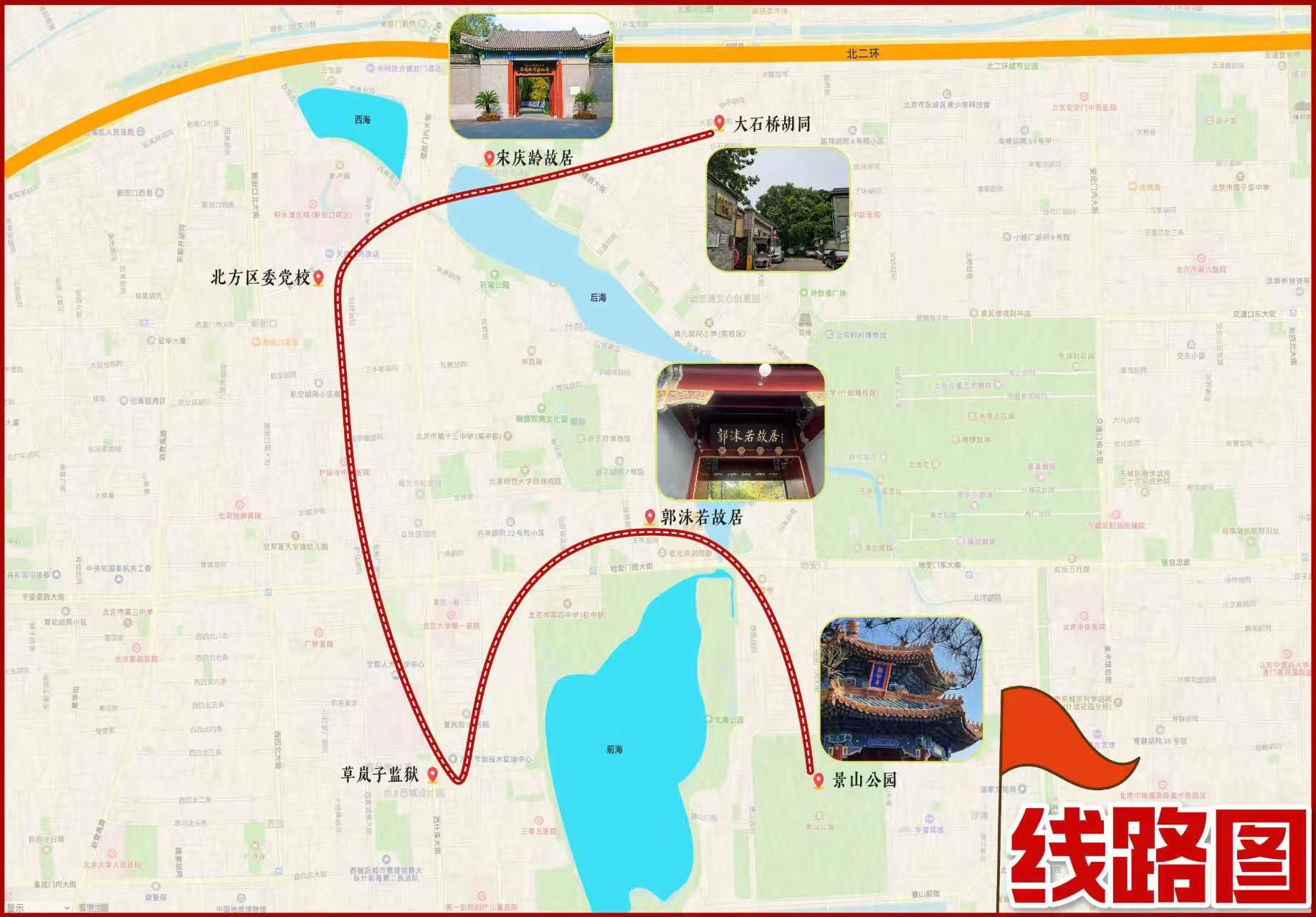 名士风骨与革命传承线路包含景山公园、郭沫若故居、草岚子监狱、北方区委党校、宋庆龄故居、王文、王凤岐电台(海畔红色电波)六个点位,融合文化名士抗战风骨、革命活动与医疗战线贡献。