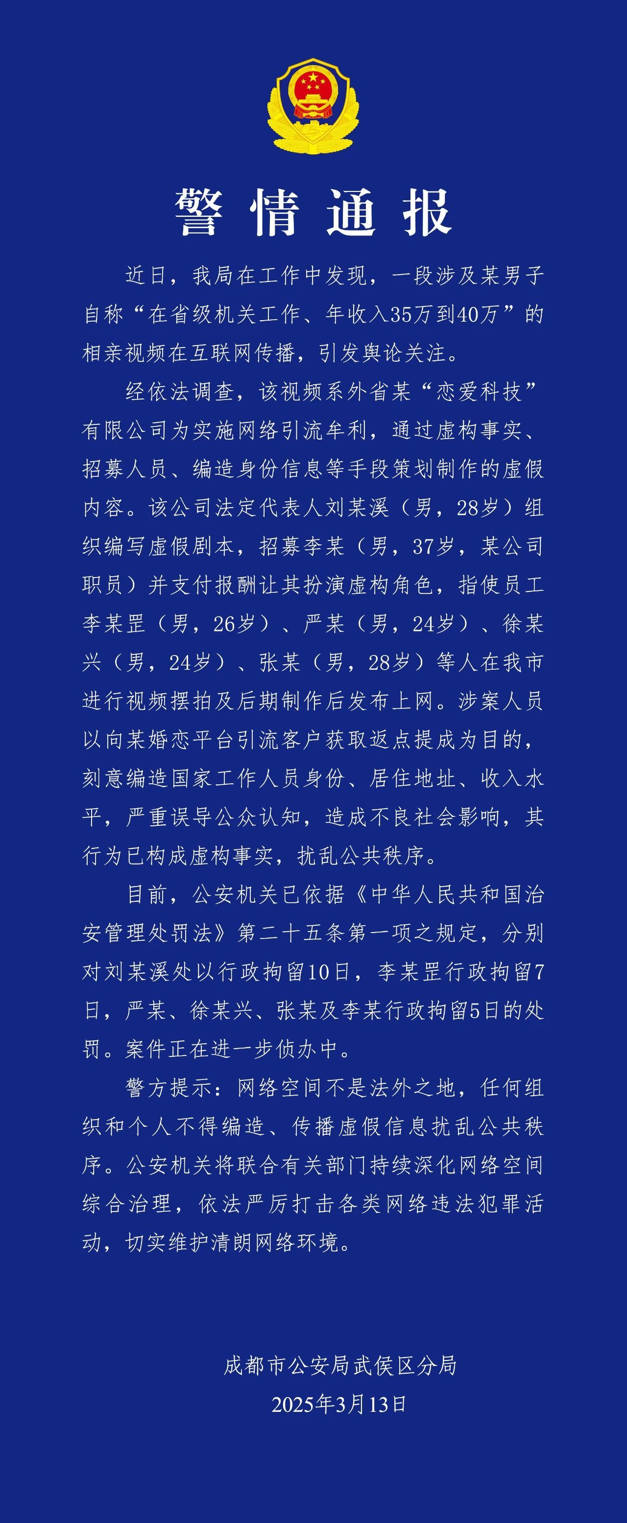 3月13日,成都市公安局武侯区分局发布警情通报:虚构“省级机关工作、年入三四十万”拍虚假相亲视频引流,6人被行拘。