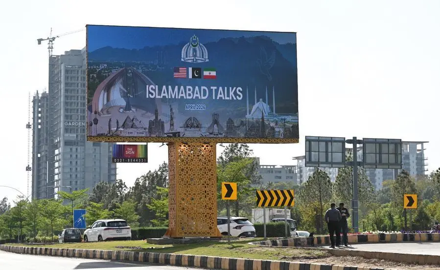 这是4月10日在巴基斯坦伊斯兰堡拍摄的美伊会谈的大型户外广告牌。 新华社发(艾哈迈德·卡迈勒 摄)