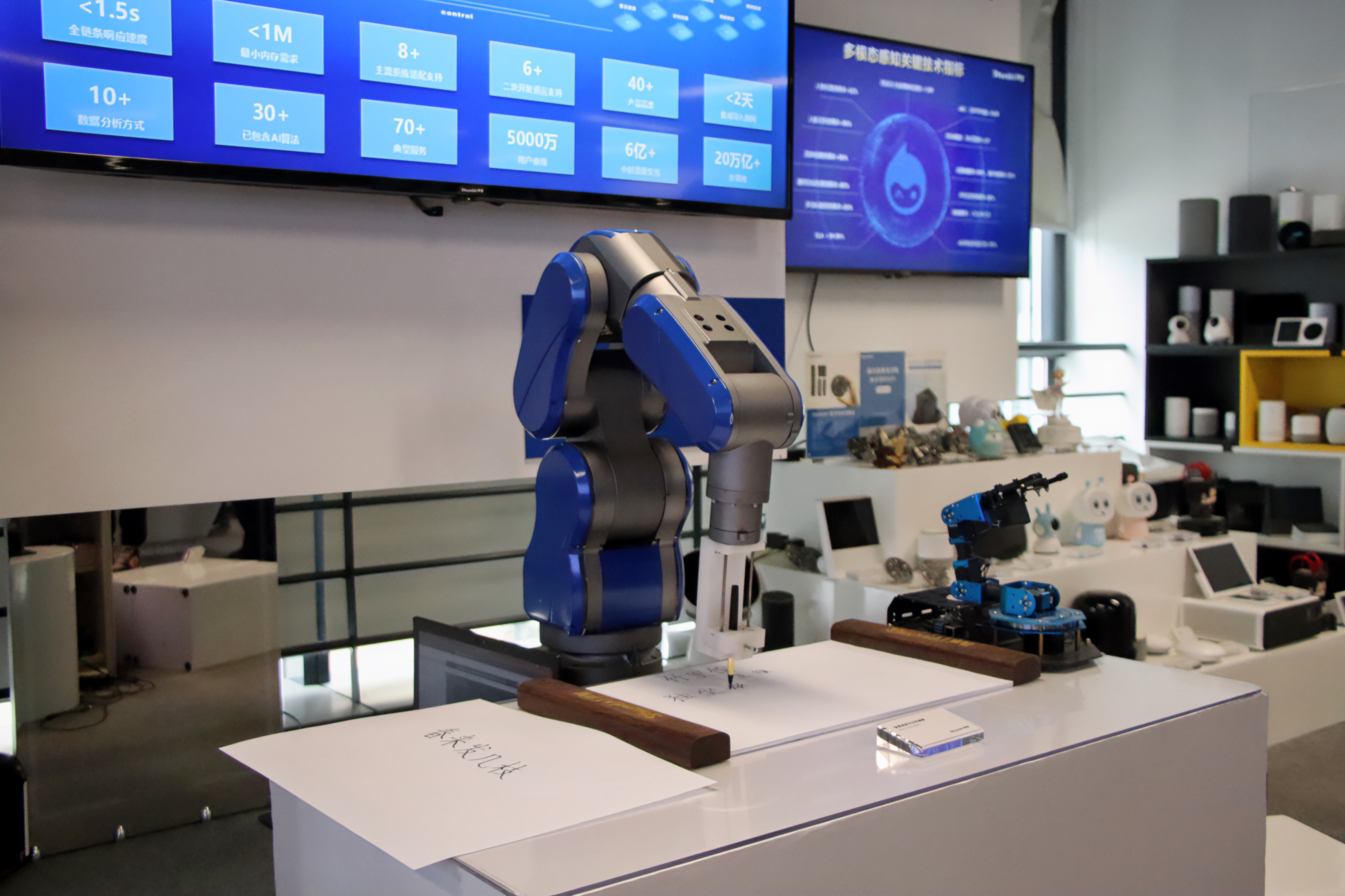 “红豆生南国,春来发几枝”,在中关村壹号园区的声智科技,展台上一台蓝灰色、显微镜大小的机器人正用“手”握笔,在白纸上书写王维的《相思》,字体工整干净,一气呵成。这是声智科技研发的一款基于声音感知的写字机器人。
