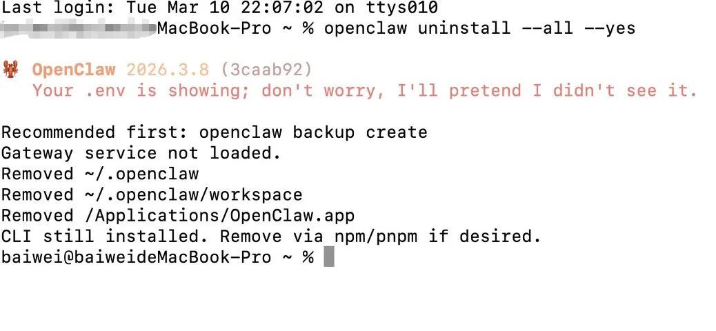 以上指令跑完后,电脑里就只剩下OpenClaw的外壳(CLI工具)了。如果想把它彻底清除,再执行一行——代码块:npm uninstall -g openclaw。至此,电脑就彻底干净了。