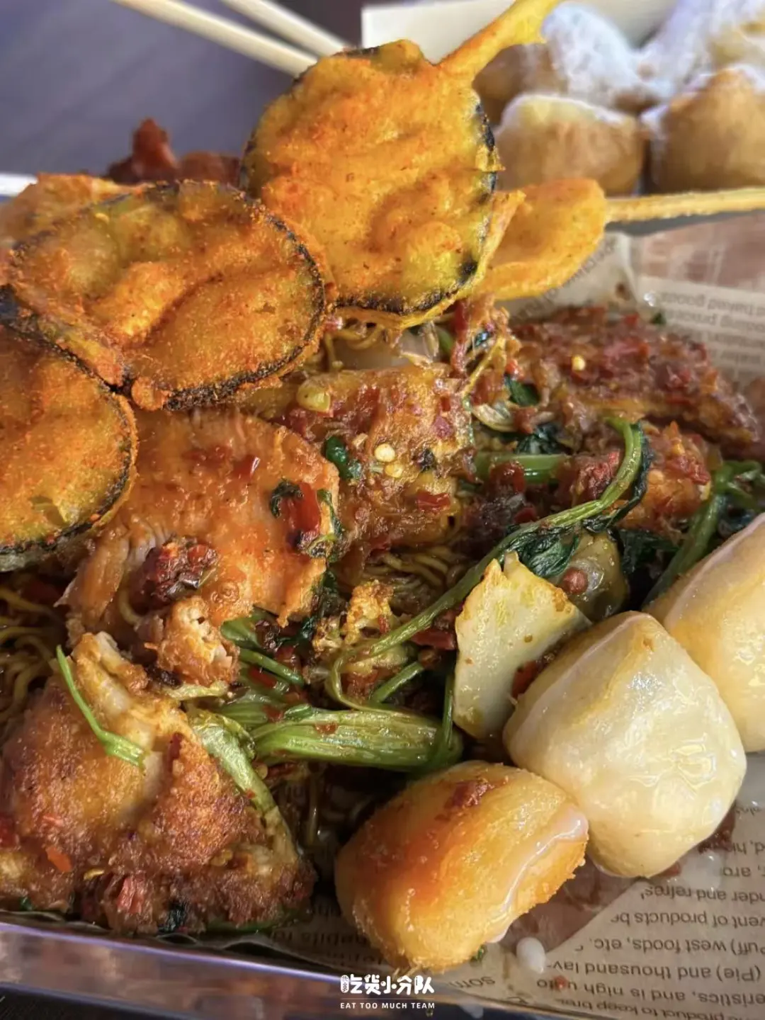 北京首家宜春炸麻辣,店不大是个档口,拿盘在柜子里选好菜后串串类会先过油炸,再去阿姨的铁板区和辣椒酱混合翻炒,素菜香辣味十足,裹完糊的茄子片土豆片酥脆入味~最近还上新了宜春扎粉,值得一试。