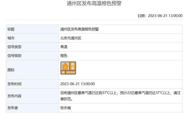 6月21日13时起,北京通州、房山、门头沟等区升级发布高温橙色预警。