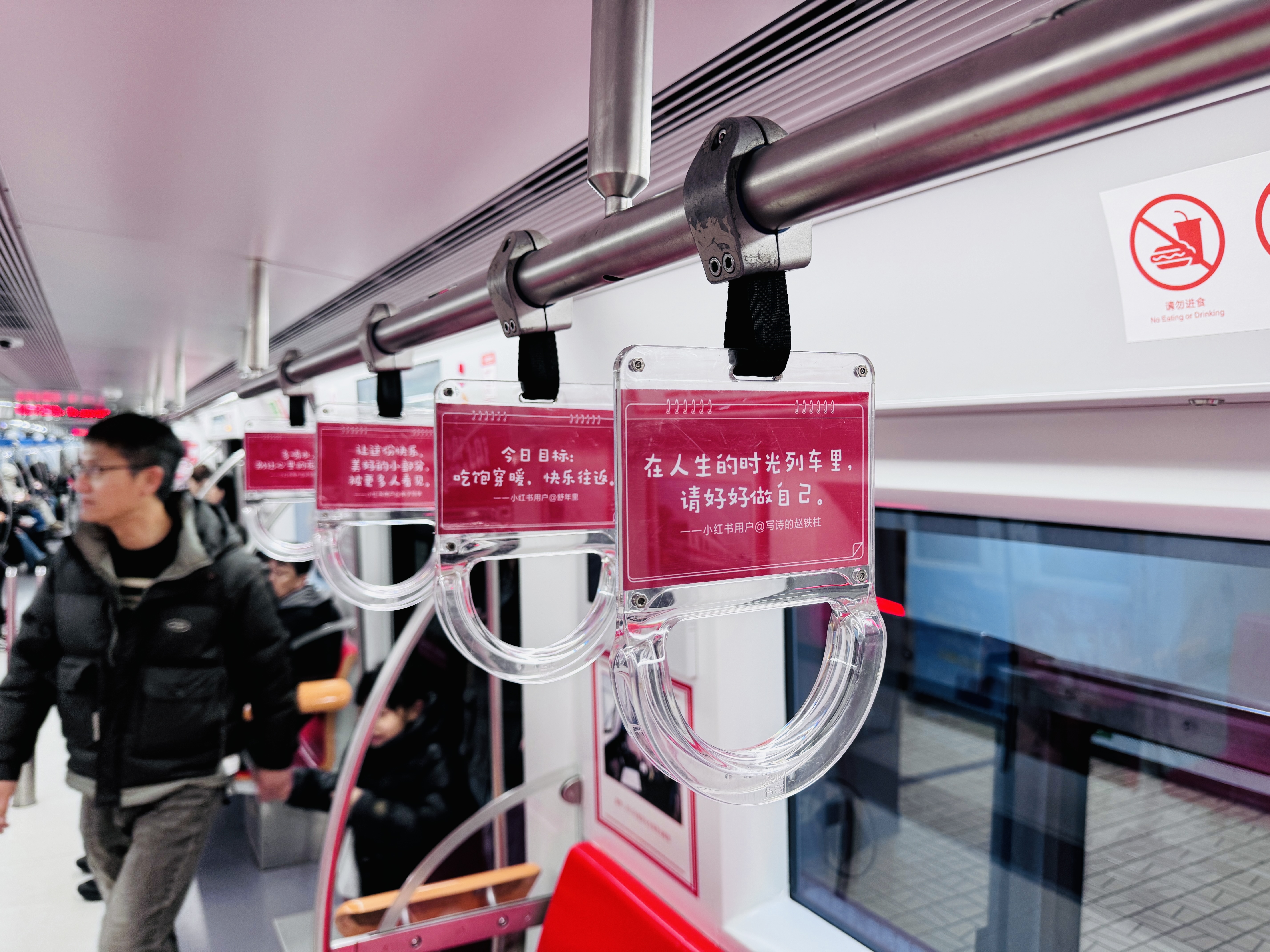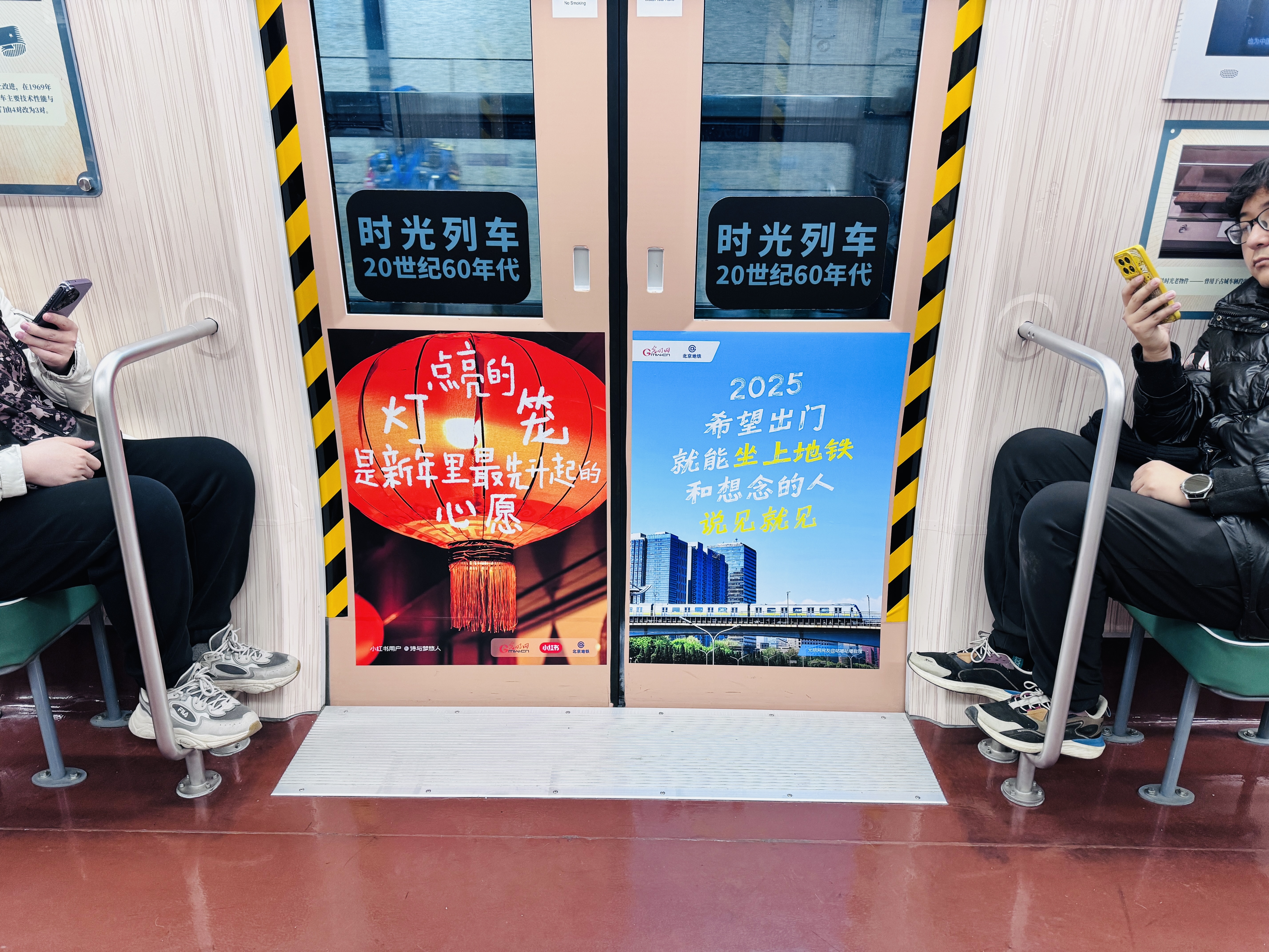为迎接新年的到来,北京地铁联合光明网、小红书在线上发起了“美好生活 快乐出行”“谢谢好好生活的我”主题留言征集活动,邀请广大网友分享发生在身边的温暖故事,并许下新一年的美好愿望。这些温暖的文字,通过不同车厢的六色手拉环设计以及主题海报的形式在时光列车上进行展示,传递人们对于美好生活的向往和期许。如果说,车上的横排绿皮座椅、老式风扇罩、油棕色地板等元素可以使乘客们感受“从当下穿越到过去”。那么,被新年愿望装点的时光列车则能够与人们共同谱写出“从现在奔向未来”。