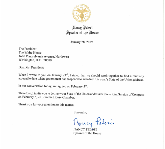 据今日美国报道,佩洛西在信中写道:"我邀请你于2019年2月5日在众议院举行的国会联席会议上发表国情咨文演讲。"她还说:"我1月23日给你写的那封信,是想说我们应该努力合作找到发表国情咨文的一个合适的时间。在今天的谈话中,我们达成了一致。"另据俄罗斯卫星通讯社报道,特朗普同意在2月5日进行演讲。