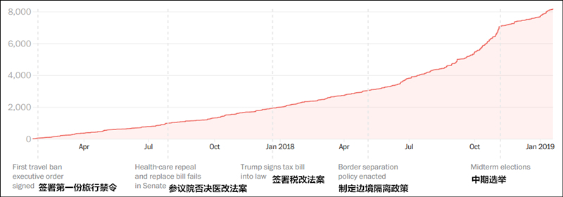 在上任前100天内,特朗普提出了492项无事实依据的观点。但到了2019年的前3周,特朗普就成功超越这一数字。此外,去年10月美国中期选举前的关键时期,特朗普在全国巡回演讲中,发表了1200多条虚假或误导性言论。