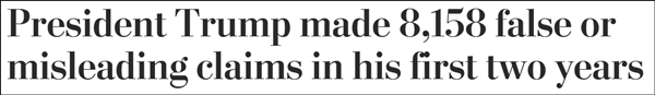 1月21日,《华盛顿邮报》根据旗下数据库"Fact Checker"统计指出,自特朗普上任以来,短短两年内已经发布了8158条虚假或误导性言论,大多数出现在第二年,有超过6000条。