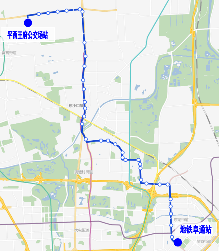 由平西王府公交场站发出,沿966路原路由至望京花园西区,向南沿广顺北大街至地铁阜通站。