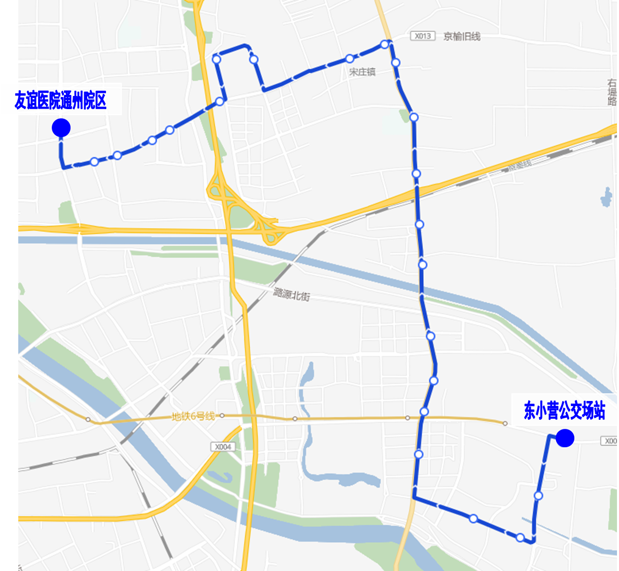 首末站:东小营公交场站-友谊医院通州院区。