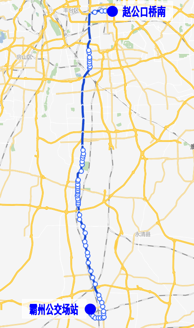增设站位:木樨园桥东、赵公口桥西(开往赵公口桥南方向)、刘家窑桥西(开往霸州公交场站方向)、赵公口桥南(终点站);取消站位:木樨园桥北、沙子口、永定门汽车站。