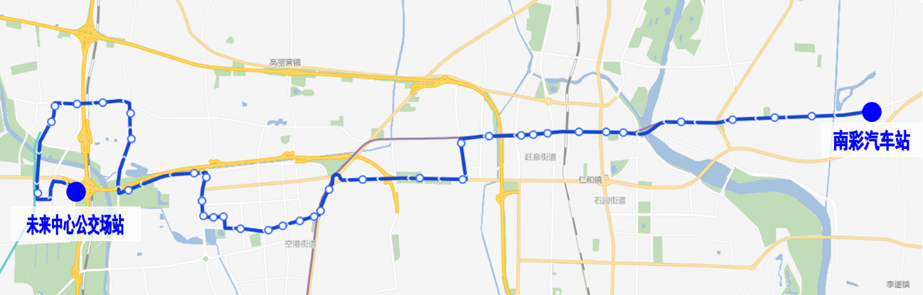 由南彩汽车站发出,经顺平辅线、府前街、府前西街、顺于路、南焦路、顺平路、京密路、火沙辅线、双裕街、裕丰路、双裕北街、天北路、机场北线南路、高白路、顺于路、英才北三街、未来科学城路、英才南二街、未来科学城东路、鲁疃东路至未来中心公交场站。
