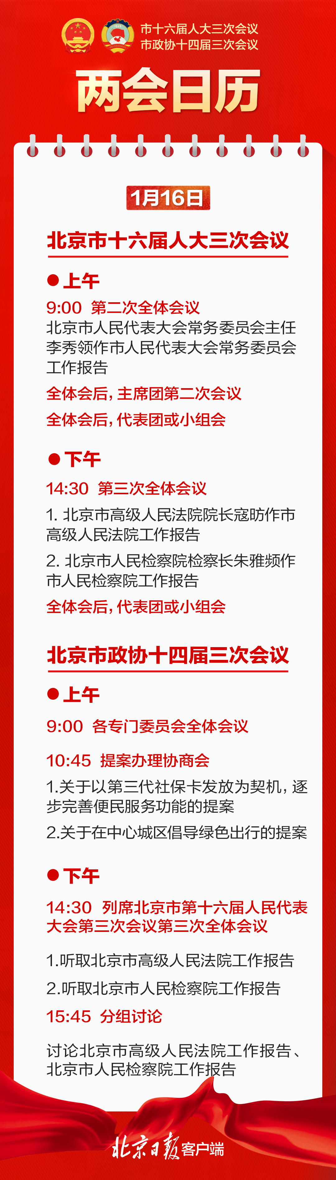 1月16日的两会日历来了!北京市十六届人大三次会议第二次全体会议举行↓↓↓