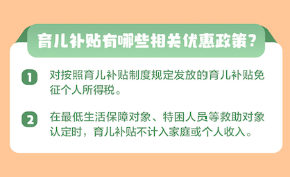 对按照育儿补贴制度规定发放的育儿补贴免征个人所得税。在最低生活保障对象、特困人员等救助对象认定时,育儿补贴不计入家庭或个人收入。