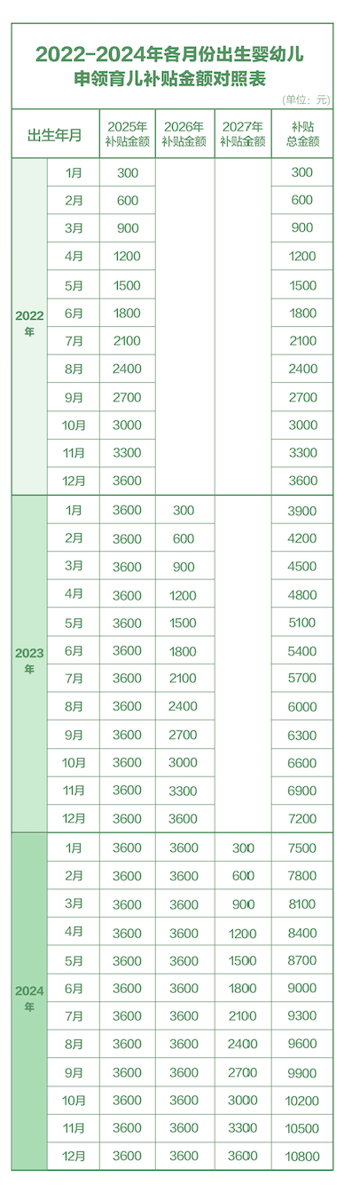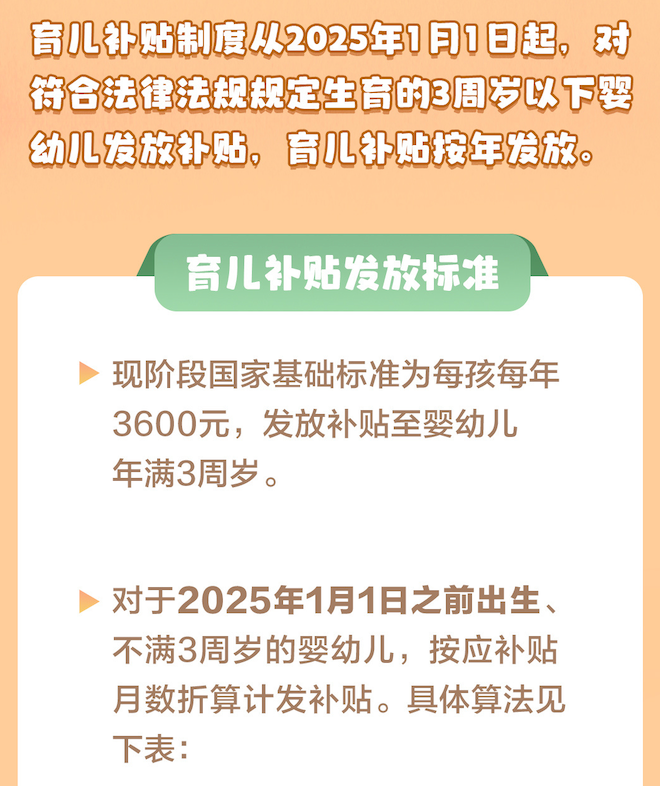 每孩每年从出生起可领取3600元,补贴直至年满3周岁。地方可根据财力适当提标,提标部分所需资金由地方财政自行承担。对2025年1月1日之前出生、不满3周岁的婴幼儿,按应补贴月数折算计发补贴。