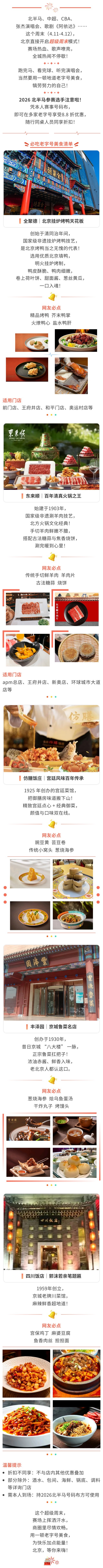 北半马、中超、CBA、张杰演唱会、歌剧《阿依达》……这个周末(4.11-4.12),北京开启超级狂欢模式!赛场热血,歌声嘹亮,全城热闹不停歇。跑完马、看完球、听完演唱会,别忘了用一顿地道老字号美食,犒劳拼尽全力的自己——半马选手凭号码牌,专享8.8折开吃!