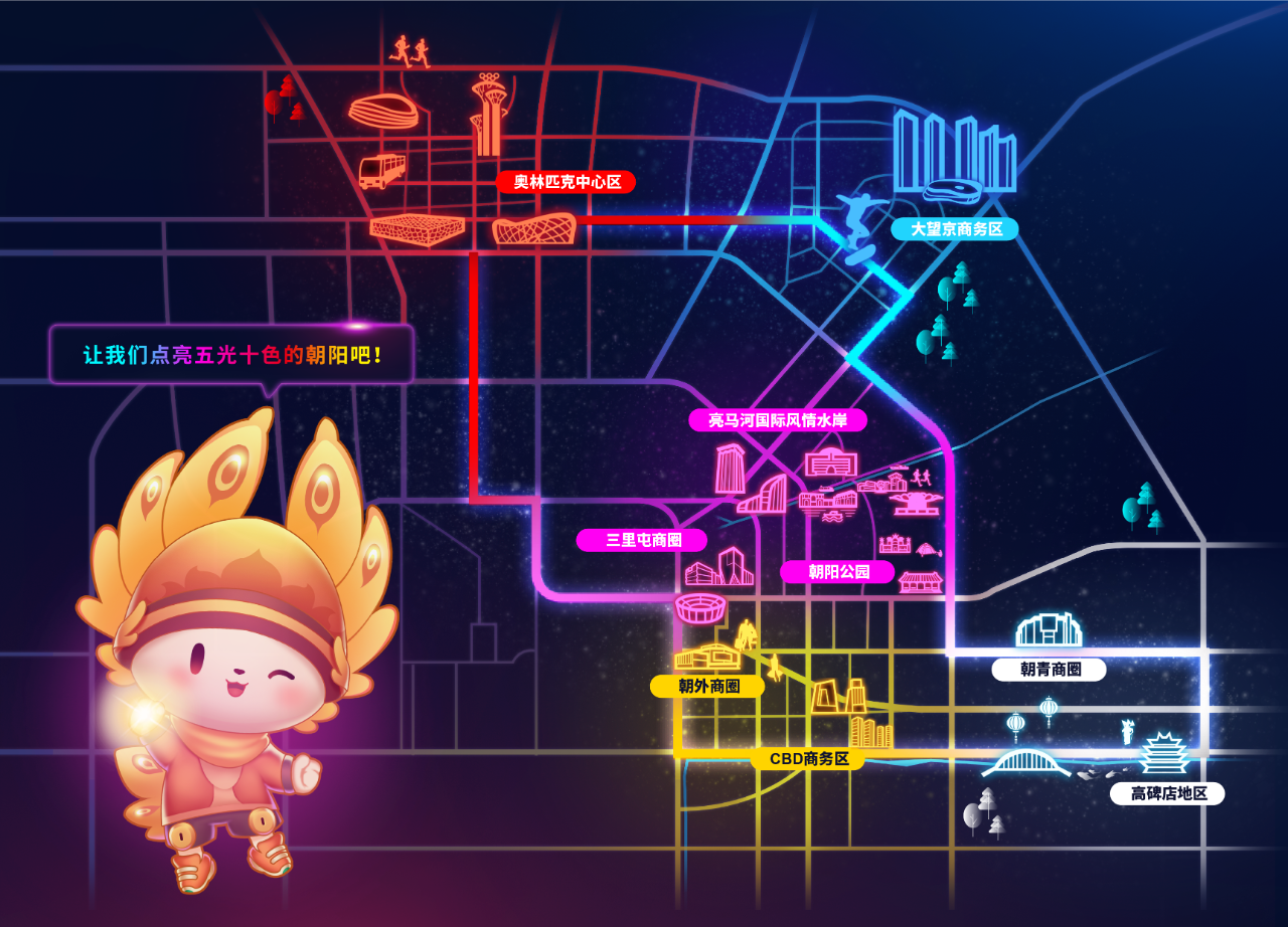 灯光节覆盖奥林匹克中心区、大望京商务区、CBD商务区、朝外商圈、蓝色港湾、三里屯、高碑店等地。灯光节期间,朝阳区还将举办百余场特色文商旅活动,艺术、音乐、美食、运动,多重时尚元素层出不穷。到朝阳来一场追光之旅,这里有一份最全攻略。