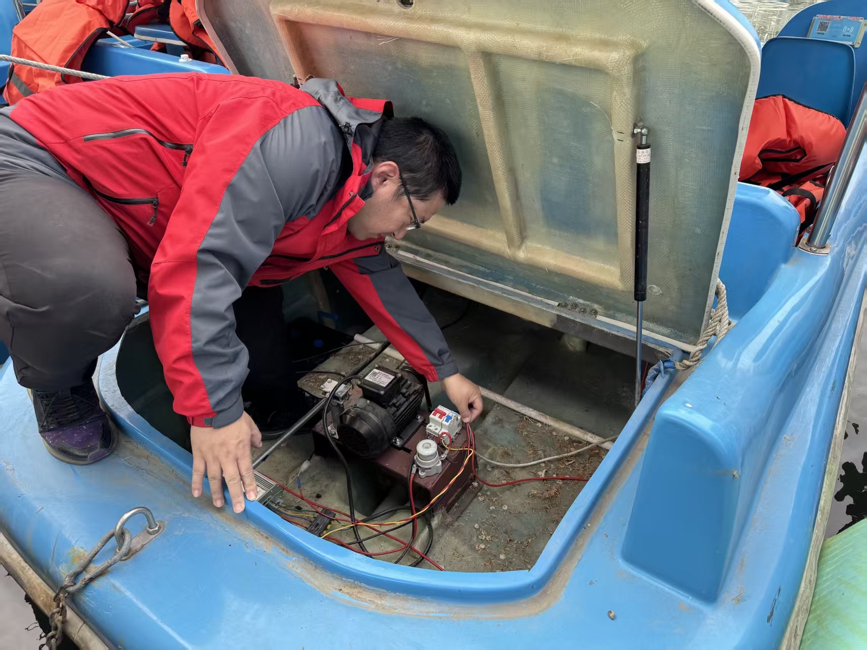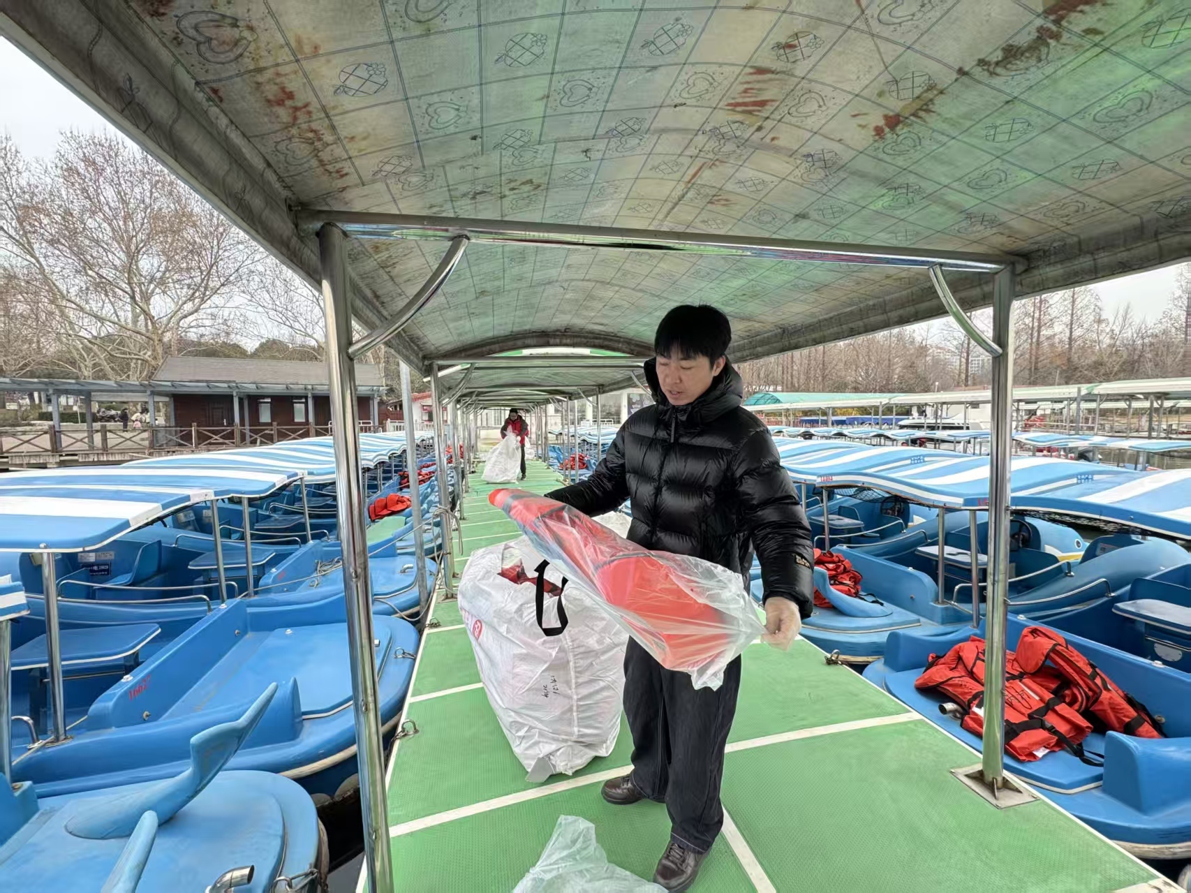 在开航前的准备工作中,公园工作人员对所有船只进行了擦拭保养,对电瓶进行充电,检查线路开关和救生设备。目前所有船只都通过了海事部门的检验,已具备开航条件。同时湖面上的救援艇也已准备就绪,码头售票窗口备足了现金,确保乘客既可以扫码购票,也可以使用现金支付。