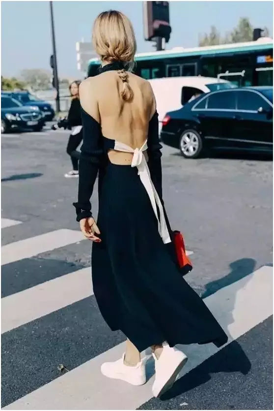 这款露背黑色连衣裙够吸睛吧,搭配小白鞋就让全场的焦点都放在了迷人的腰背上,没错,小白鞋在这里起的是陪衬的作用。