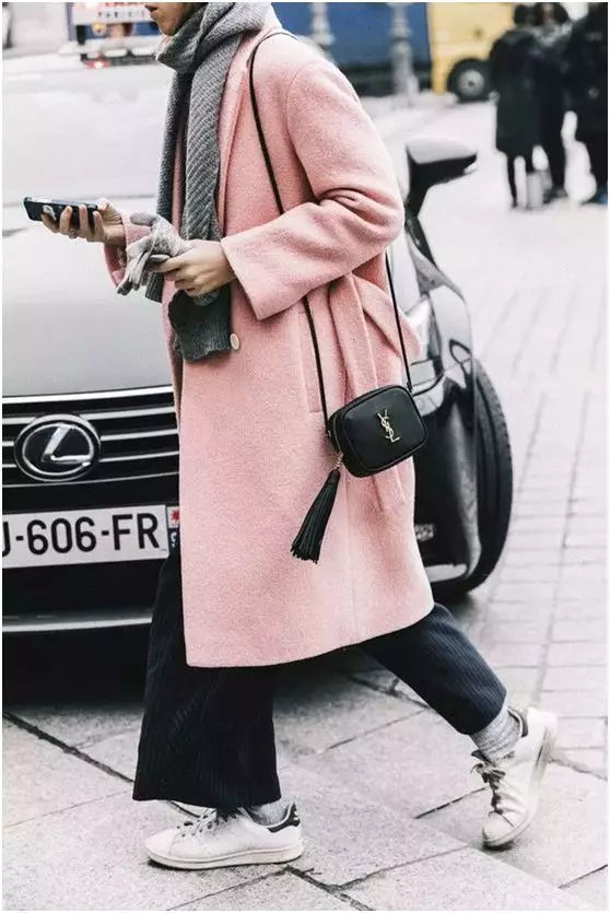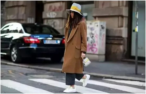 就算到了寒冷的冬天,小白鞋也有它的用武之地,一身沉闷的棕色大衣+深灰色阔腿裤有了小白鞋的点缀,一下子轻松活跃起来。