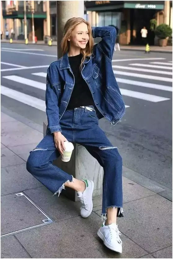 阿迪的小绿尾曾几何时也是烂大街的款式,一身全白加上尾巴上的一抹绿,吸睛亮眼,春夏搭配一身牛仔衣,微微露出脚踝,迷人的脚脖子反而成为全身最性感的部位。