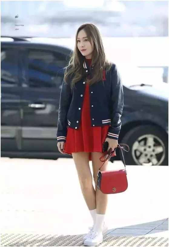 Jessica郑秀妍的机场街拍中,棒球衣搭配红色连衣裙非常提气色,小白鞋搭配白色中筒袜,元气满满呢~