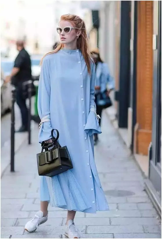 慵懒风加小白鞋应该是穿搭界的"极简法",轻轻松松就能既随意,简单又高级。这款浅蓝色长款连衣裙搭配白色跑鞋,将随性慵懒的混搭风演绎的淋漓尽致。