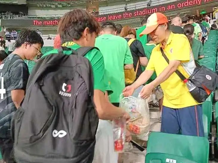 比赛结束后,引导员号召观众朋友做到“人走场净”在他们的影响和带动下,许多球迷没有急着离开,而是把看台上的垃圾捡拾干净后才有序退场。