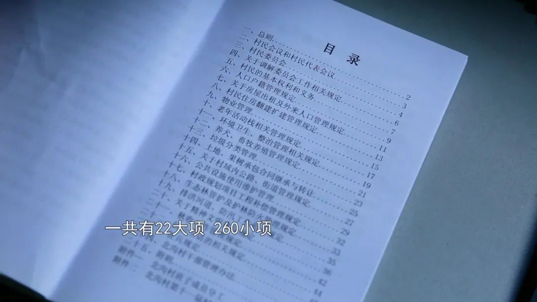 王全说《村规民约》涵盖了村民生活的方方面面,比如农村养狗问题,《村规民约》规定狗能出院,但一次不拴绳年底就要扣200元,现在村民晚上遛狗都知道要牵绳了,这就是规矩。还有垃圾自觉分类投放、车辆不乱停乱放、家庭和睦、邻里团结等等,从个人到家庭再到集体,“约定”已经成为了北沟村村民自我管理、自我约束的道德标尺。