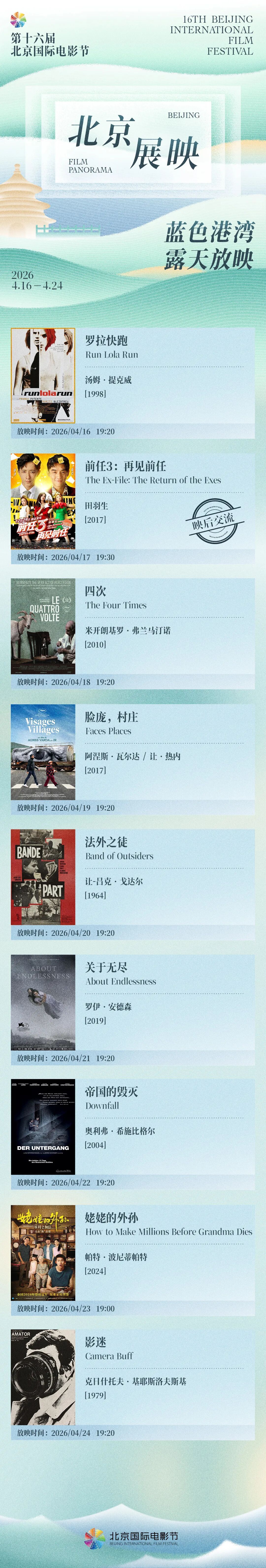 为满足观众对多元化观影场景的期待,第十六届北京国际电影节“北京展映”将在蓝色港湾进行露天放映,让电影走出传统影院,融入城市夜色与公共空间。