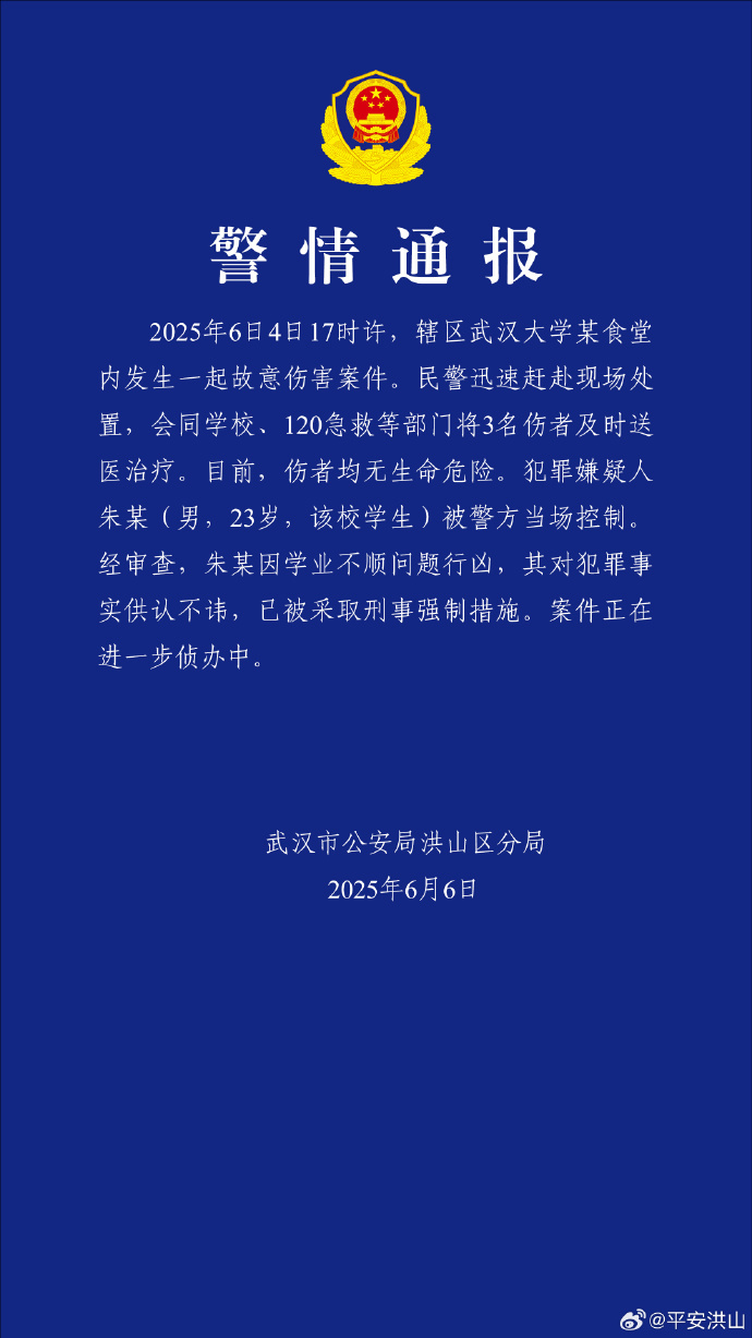 警方通报武汉大学伤人事件:嫌疑人因学业不顺行凶,3人受伤。详情如下