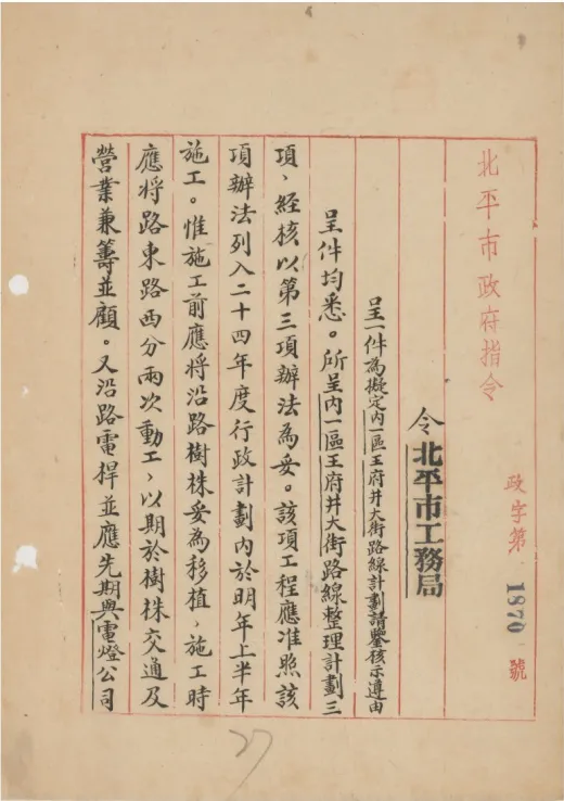 北平市政府关于修缮王府井大街路线计划给市工务局的指令。
