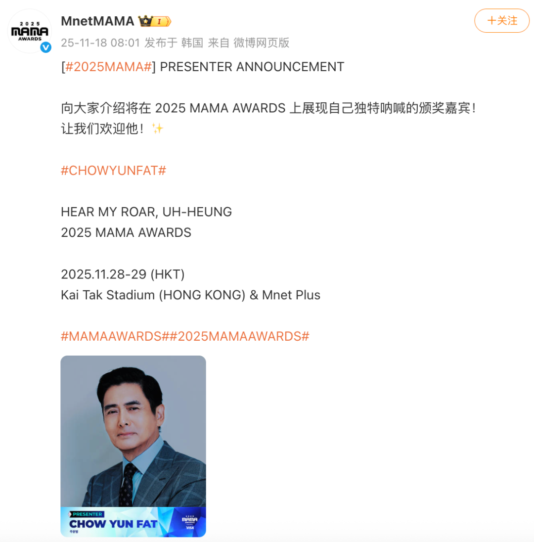 此前报道,11月18日,Mnet官方宣布,周润发将担任2025年MAMA(Mnet亚洲音乐大奖)颁奖礼颁奖嘉宾。
