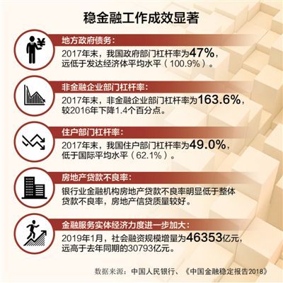 稳金融政策。去年底召开的中央经济工作会议指出,稳健的货币政策要松紧适度,保持流动性合理充裕,改善货币政策传导机制。这释放了稳金融政策的明确信号。当前,应注意以下几个方面:一是畅通利率传导渠道。要把握货币政策最终目标,继续推进利率市场化改革,强化货币政策前瞻性指引作用。二是提高货币政策的信贷传导效率。商业银行在货币政策信贷传导中扮演着重要角色,提高货币政策的信贷传导效率就要强化竞争,提高商业银行市场化经营水平,提高商业银行信贷资源配置效率和风险管理能力,减少地方政府部门对商业银行的不当干预。三是注重货币政策与财政政策协调配合。在实施稳健的货币政策的同时,充分发挥财政政策的作用,通过大规模减税降费降低企业成本,激发企业投资意愿,引导企业对我国经济平稳增长的预期。同时,在控制债务规模总量的前提下,较大幅度增加地方政府专项债券规模,稳妥处理地方政府债务风险。