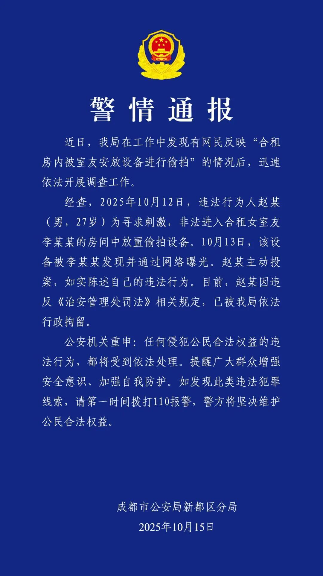 成都警方:赵某偷拍合租女室友,行拘!