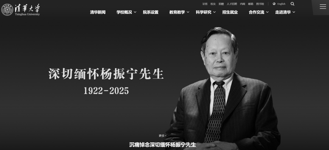 今天(10月18日),清华大学官网首页变为黑白,头图写道“深切缅怀杨振宁先生”。