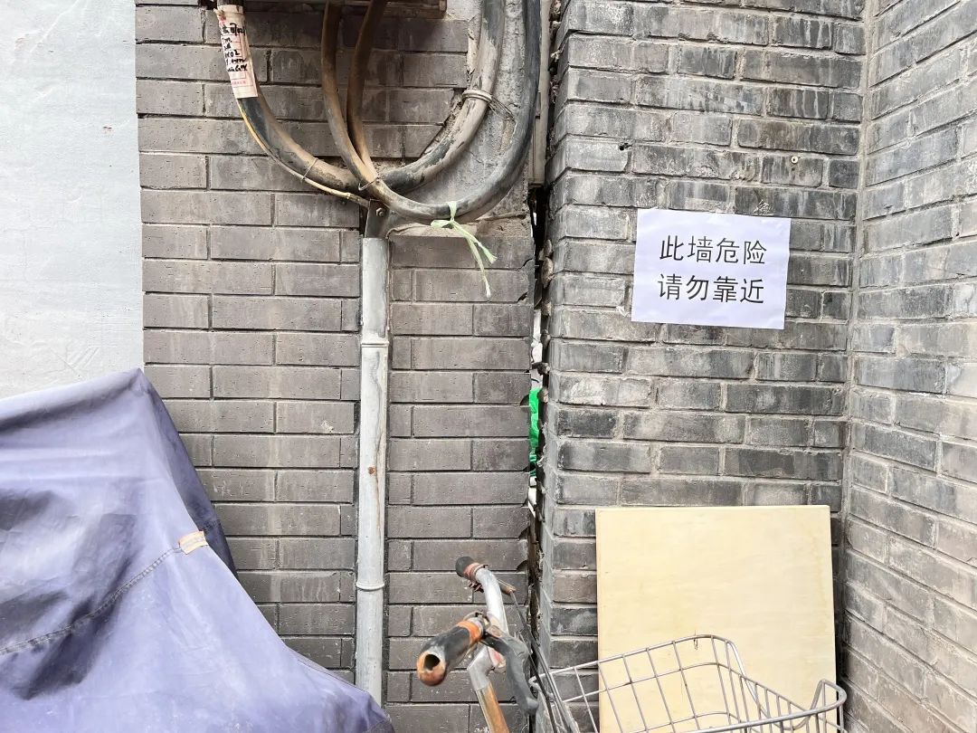 “我们马上到现场查看情况。”情况危急,虽然是周六休息时间,琉璃厂西街社区工作者尹丽娜还是快速到现场查看危墙情况。发现13号院大门不到一米宽的东墙与另一面墙的连接处出现了裂缝,威胁着居民的出行安全。