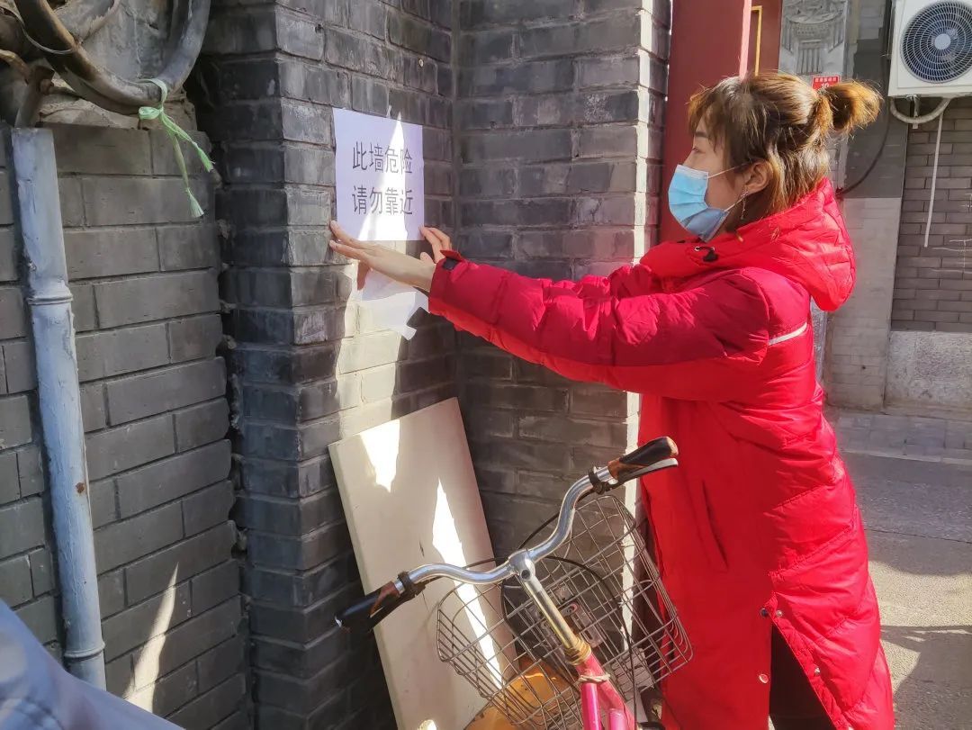 为了保障周边居民安全,尹丽娜一边通过电话向街道城市管理办公室上报情况,一边挨家挨户通知居民注意出行安全,将30余户居民全部通知到位后,她赶紧回到社区打印了“此墙危险 请勿靠近”安全警示标识,与同事一起多角度张贴后才离开。