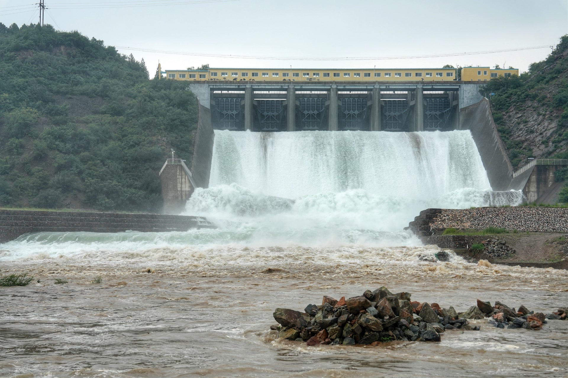 除了密云水库,为发挥水库拦洪削峰作用,充分拦蓄上游洪水,7月27日,怀柔区三座水库开始泄洪,怀柔水库自西溢洪道泄洪,每秒达34立方米;大水峪水库以每秒35立方米泄洪;北台上水库以每秒28立方米泄洪。平谷区海子、西峪、黄松峪、杨家台、花峪五座水库正在开展泄水作业,河道出现了明显涨水过程,流速较快、水流湍急。