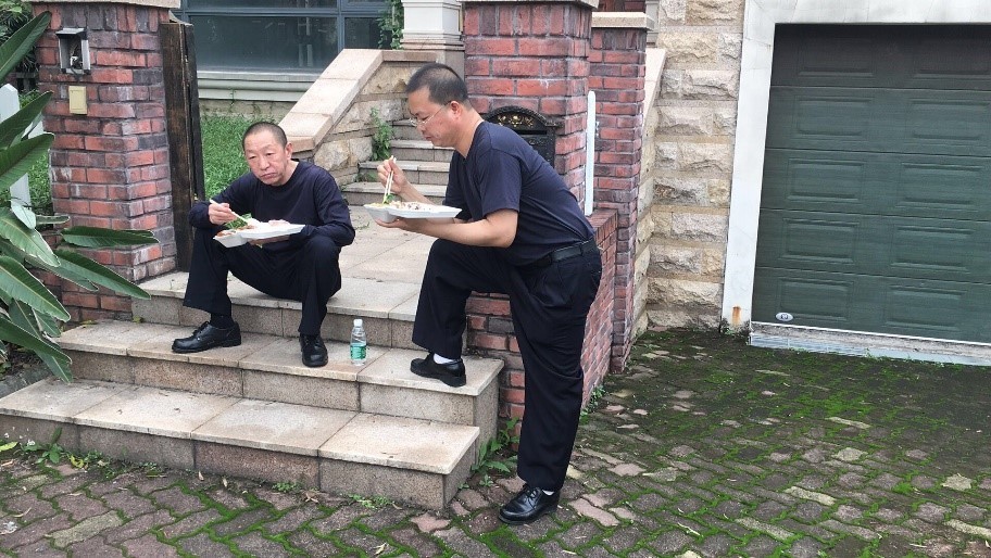 勘查别墅入室盗窃案,由于现场错综复杂,勘查时间较长,民警坐在别墅门口阶梯处吃起了盒饭。