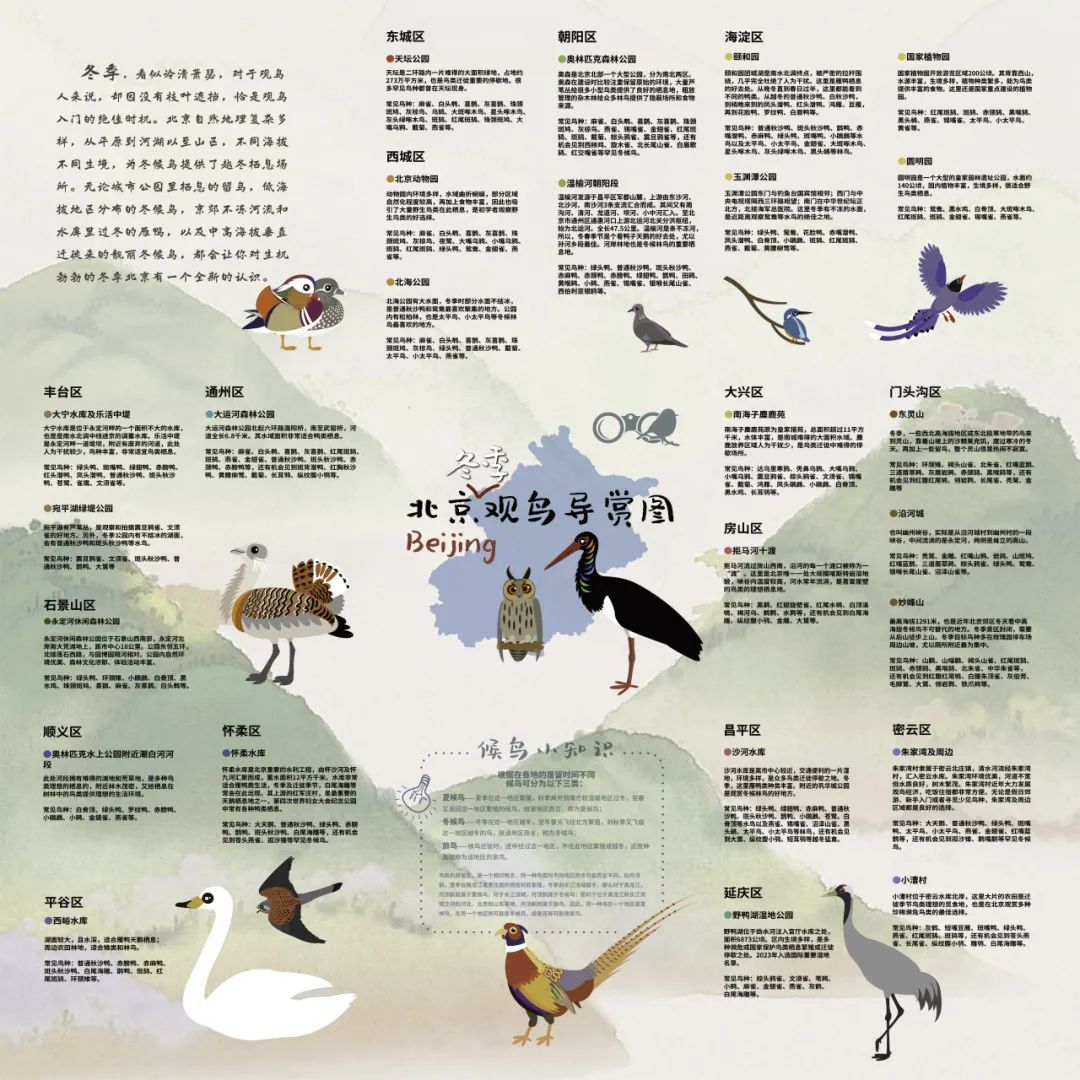 为了让广大观鸟爱好者在冬日里也能享受到自然之美,快速找到最适合的观鸟地点,北京市园林绿化局与北京野生动物保护协会联合发布《北京冬季观鸟导赏图》。列出了北京地区适宜冬季观鸟的25个地点,并介绍了易见的鸟类,希望可以为您的冬日观鸟之旅提供便捷指引。
