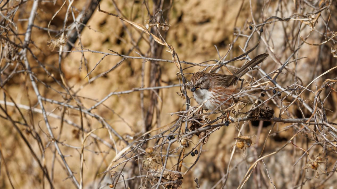 冬季,一些西北高海拔地区或东北极寒地带的鸟来到灵山,靠着山坡上的沙棘果充饥,度过寒冷的冬天。再加上一些留鸟,整个灵山很是热闹不寂寞。
