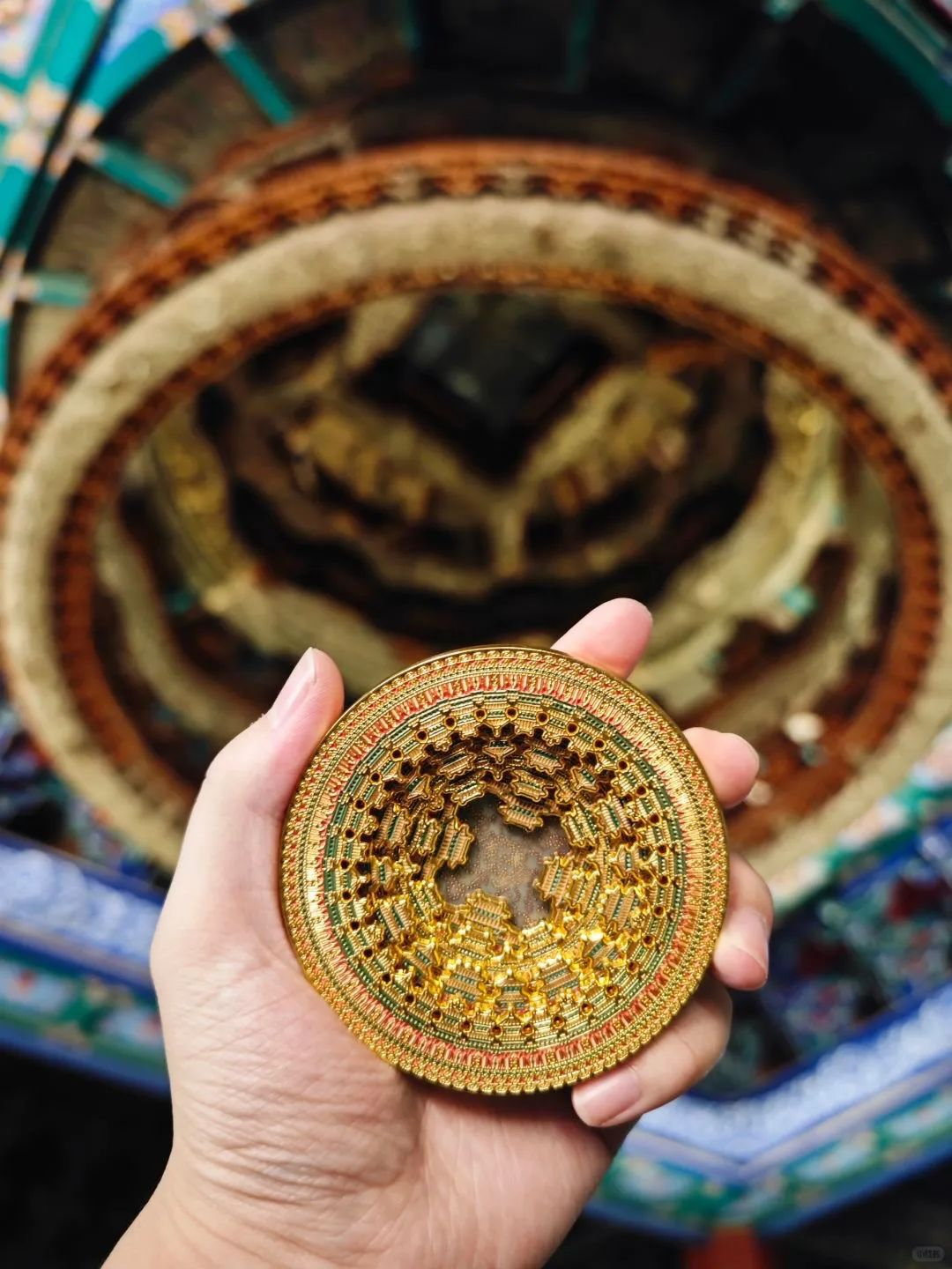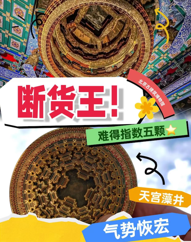 (图片出自网友)冰箱贴原型是北京古代建筑博物馆的“镇馆之宝”:隆福寺·万善正觉殿天宫藻井。北京古代建筑博物馆位于先农坛内,而天宫藻井就位于先农坛太岁殿中,有“最美藻井”之称,也被网友称为“天花板中的天花板”。